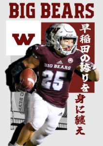 花宮さんがモデルとなった早稲田大学米式蹴球部 BIG BEARSのポスターとご本人。早稲田大学は2022年12月、全日本大学アメリカンフットボール選手権大会の決勝戦「甲子園ボール」で準優勝を果たしました。その礎を築いた花宮さんの活躍についてはこちら