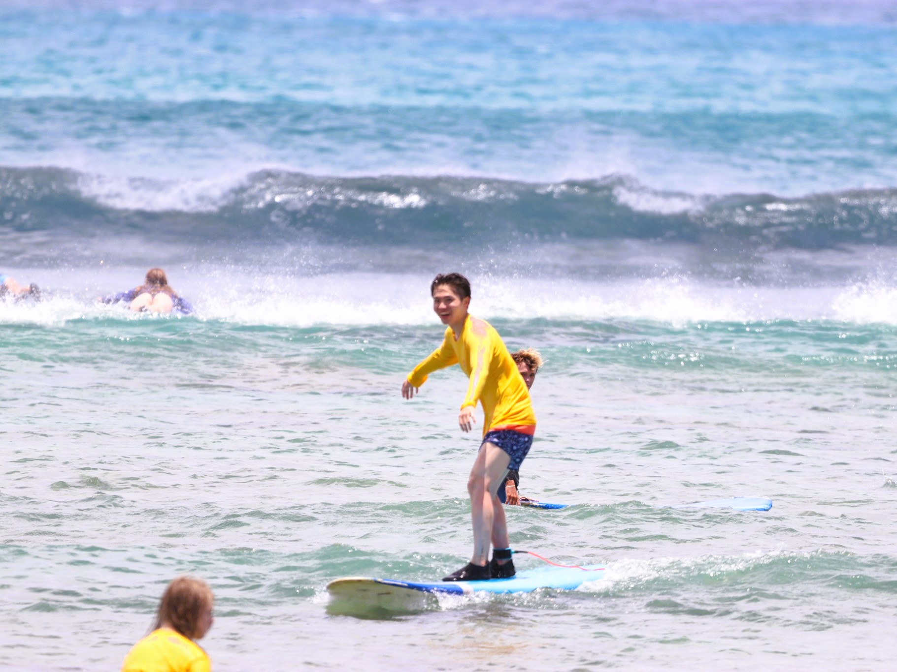 サーフィンもれっきとしたハワイ文化であるという建前の下、しっかりマリンスポーツで楽しんできました(笑)。初めて挑戦したのですが、想像以上に難しく、20m程度しか進むことができませんでした。しかし、様々な国の方々とサーフィンを通じて仲良くなることができ、英語ができない僕にとって「スポーツは言語の壁を超える」を実感した瞬間でした。